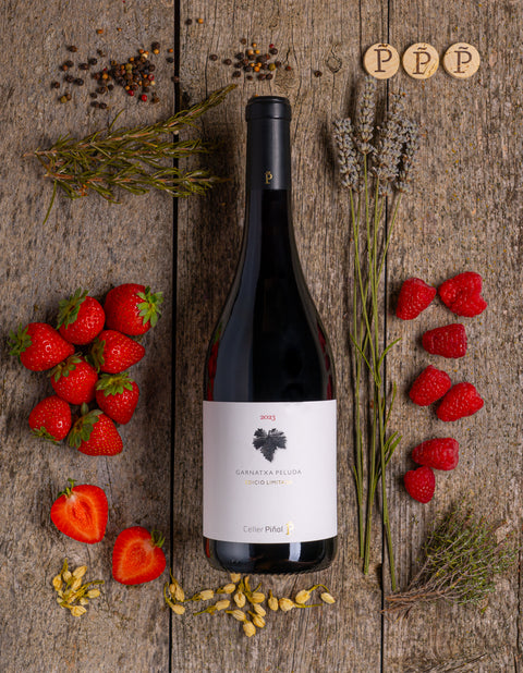 Vi de vinyes Velles de Garnatxa peluda 100%. Bomba de fruita vermella i negra amb tocs d'herbes mediterrànies i espècies. A la boca és vibrant, fresc, equilibrat amb tocs de pebre negre al final. Textura fina, elegant amb ampli post-gust. Ideal per maridar amb carns vermelles, xai, verdures i formatges.